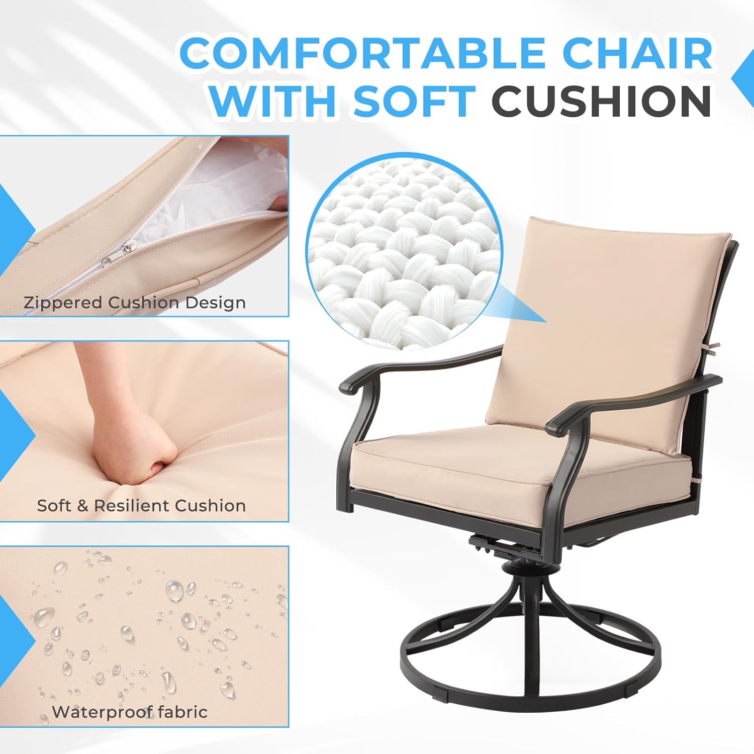 - AllSwivel & Rocking Design: Featuring with a round and swivel base, the swivel outdoor chairs could provide ultimate comfort with a 360° swivel and a gentle rocking motion. Equipped with soft cushion, the chair provide extra comfortable sitting experience to you and allowing you to enjoy your outdoor life