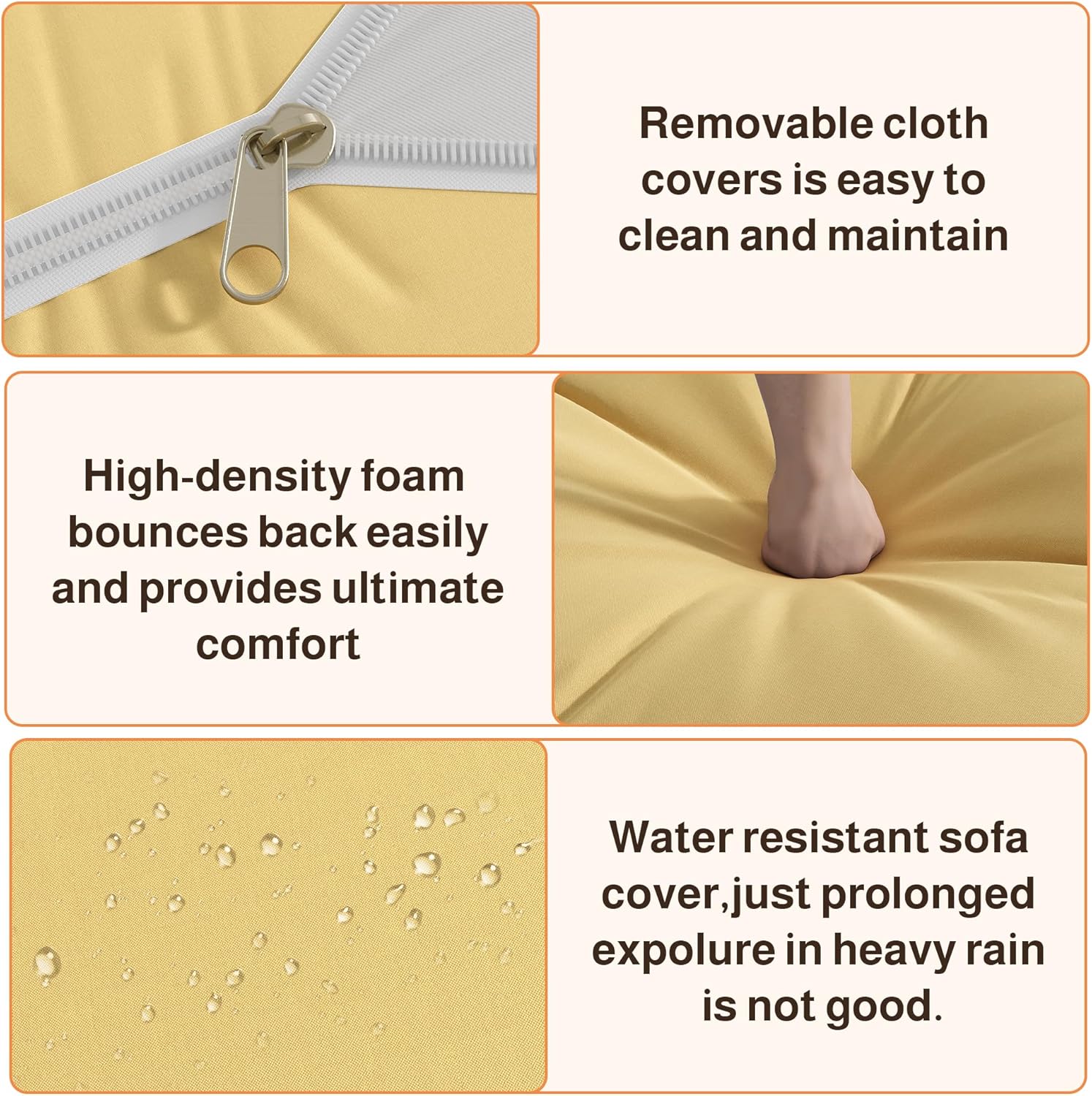 - Plush & Easy-to-Clean Cushions: 4-inch thick cushions deliver enhanced comfort on every seat. The water-resistant covers are removable and machine washable, helping your outdoor patio furniture set stay fresh with regular use.