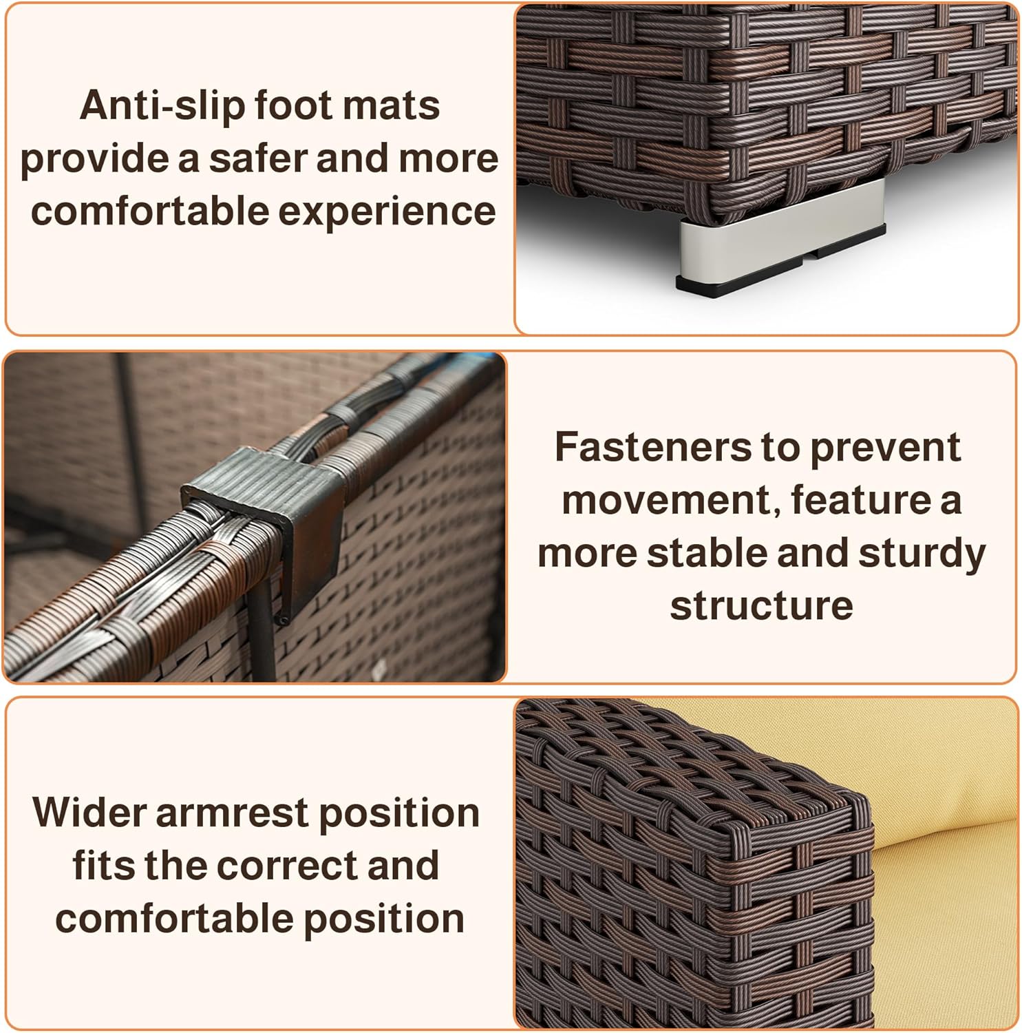 - Durable & Weather-Resistant Materials: This patio furniture set features woven PE rattan and a sturdy steel frame for enhanced durability. It resists cracking, fading, and rust, making it suitable for various outdoor environments. The glass tabletop is easy to clean, and seat clips help keep the outdoor chairs securely in place.