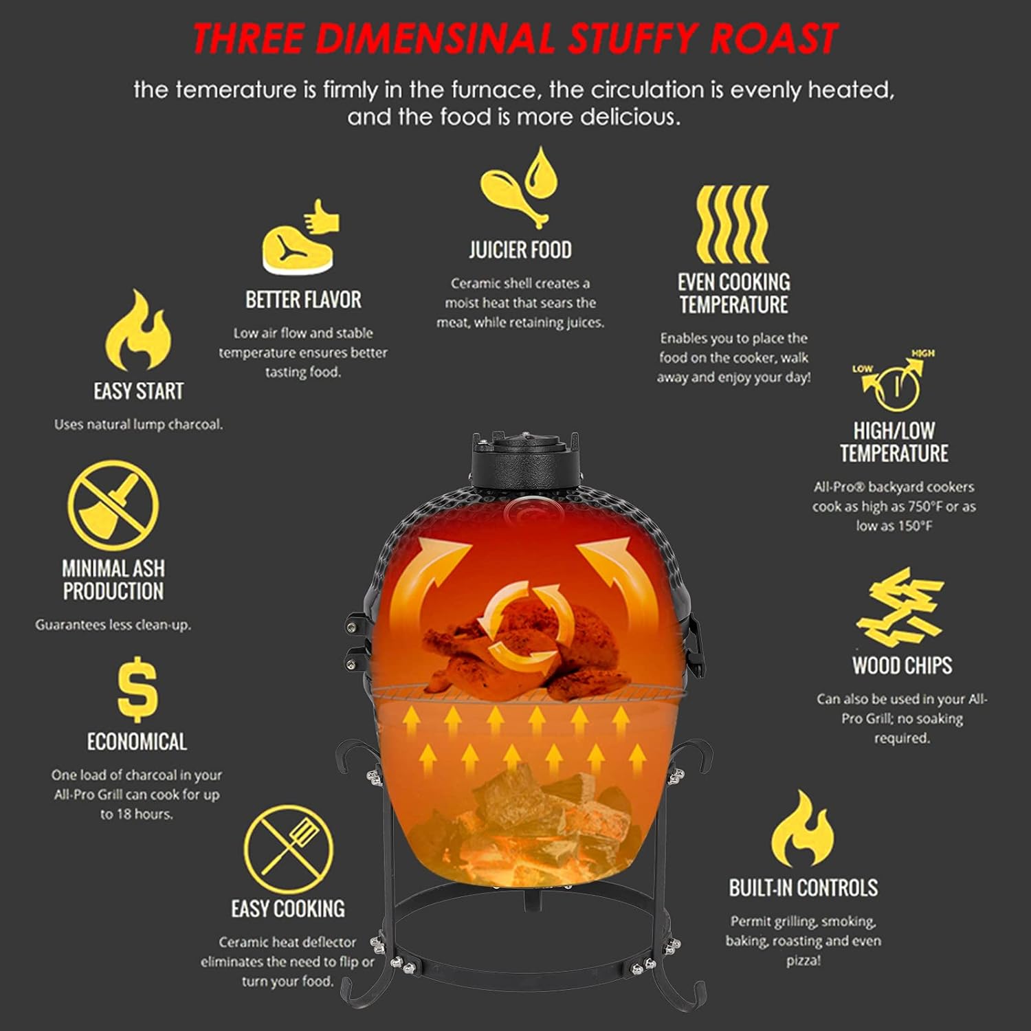 - True Charcoal Flavor Master: Kamado-style ceramic construction amplifies smoky aroma without lighter fluid,using 40% less charcoal than traditional grills for eco-friendly grilling.