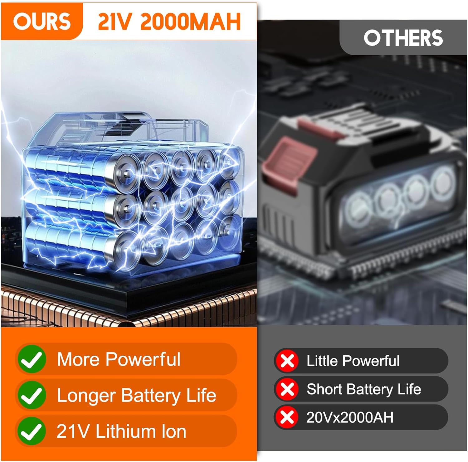 - Dual Safety & Long-Lasting Batteries: Includes 2× 21V 2000mAh lithium batteries and a fast charger for extended runtime. Double-switch safety lock and debris guard prevent accidents, making it safer than gas trimmers—low noise and zero emissions