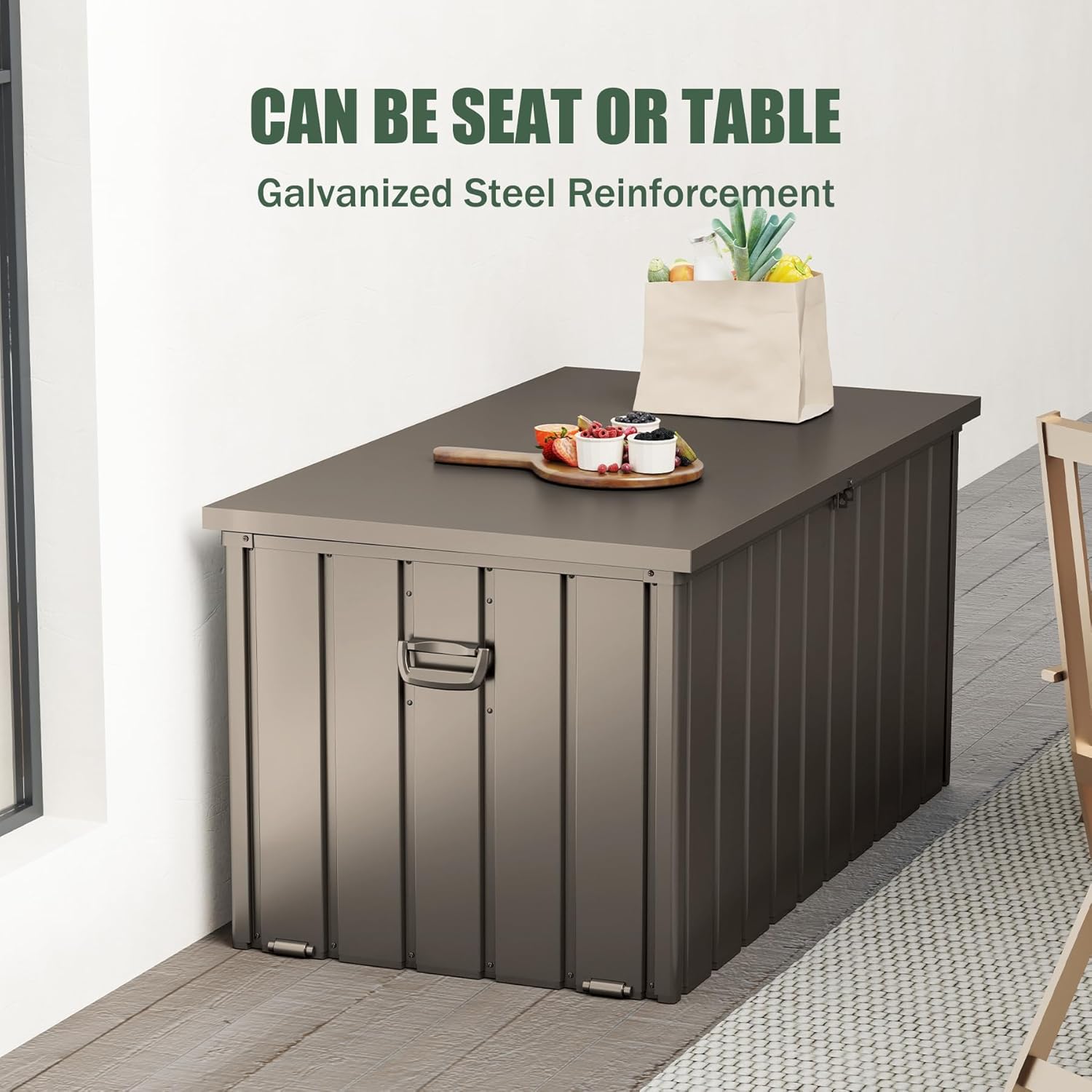 Domi Deck Box 150 Gallon, Waterproof Lockable Steel Outdoor Storage Container for Outside Cushions, Garden Tools and Pools Equipment, Brown