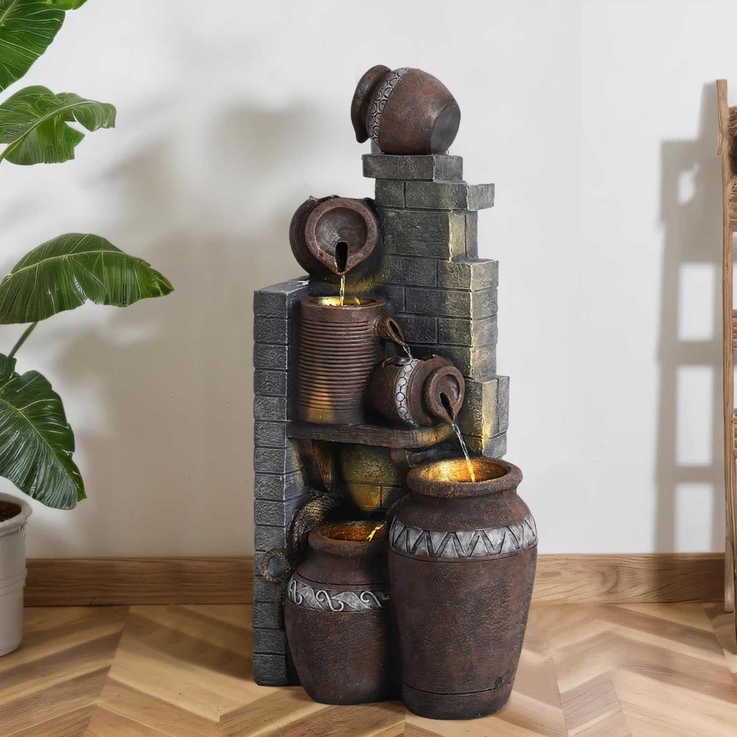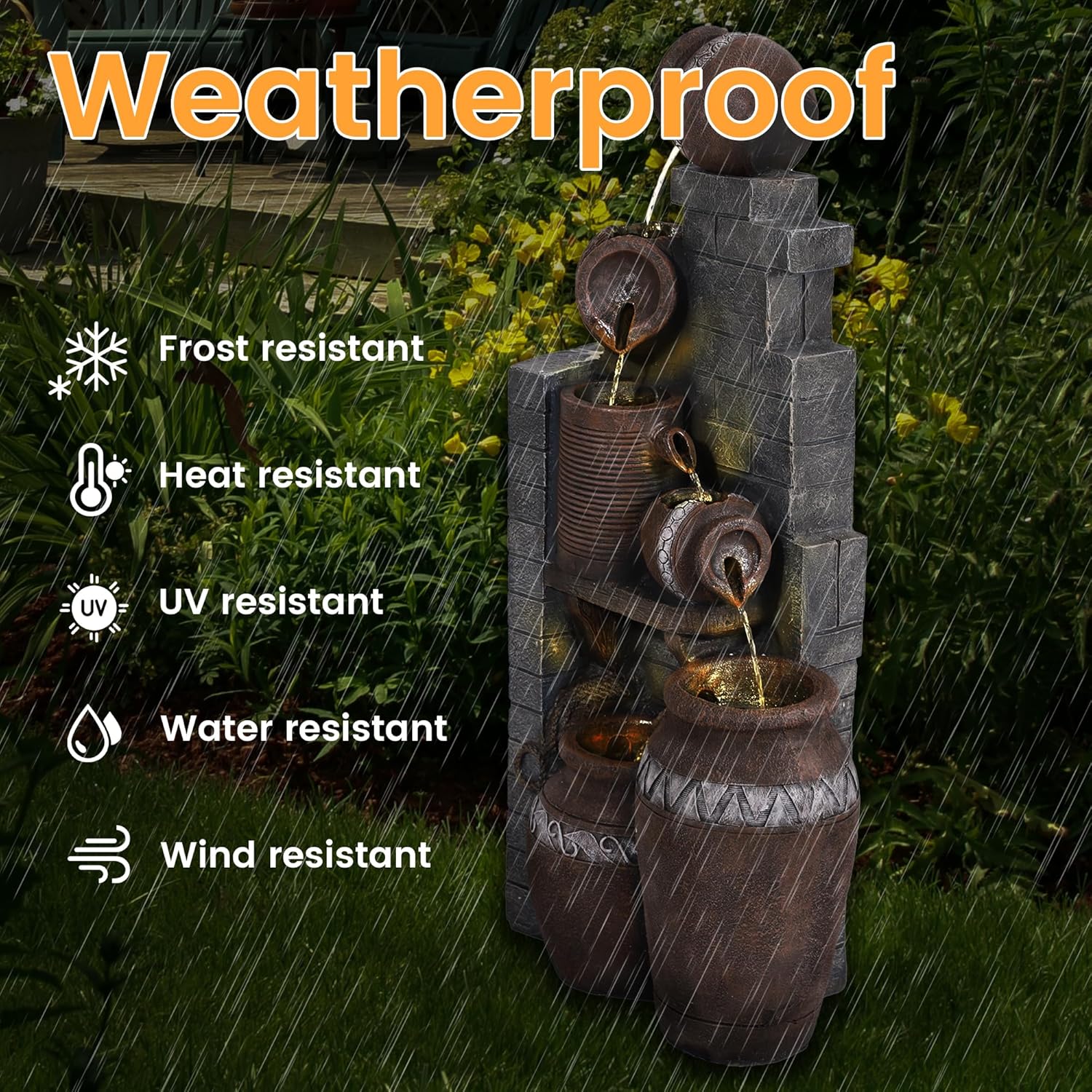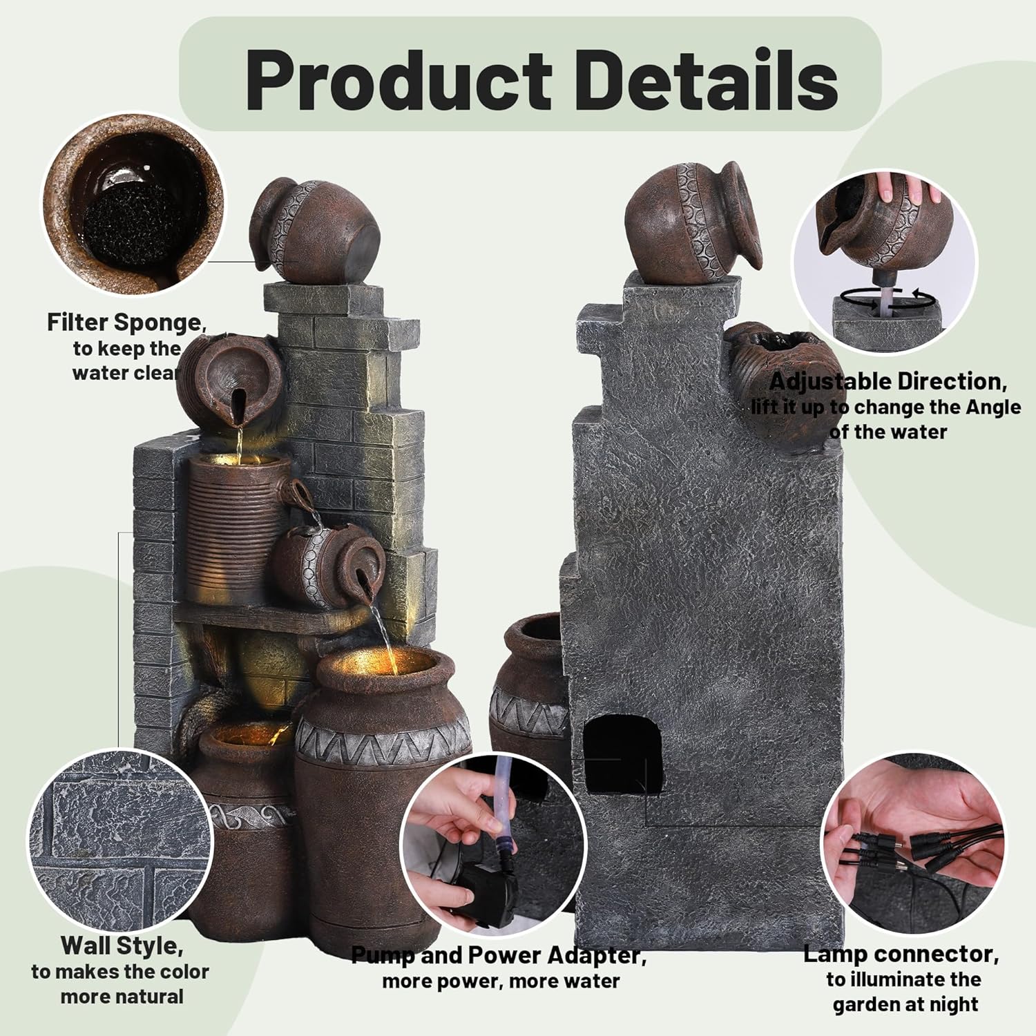 6-Tiers Garden Waterfall Fountain Outdoor - 31’5''H Water Fountains and Waterfalls, Large Outdoor/Indoor Floor Standing Resin Water Fountain with LED Light for Patio, Garden and Home (31.5”H)