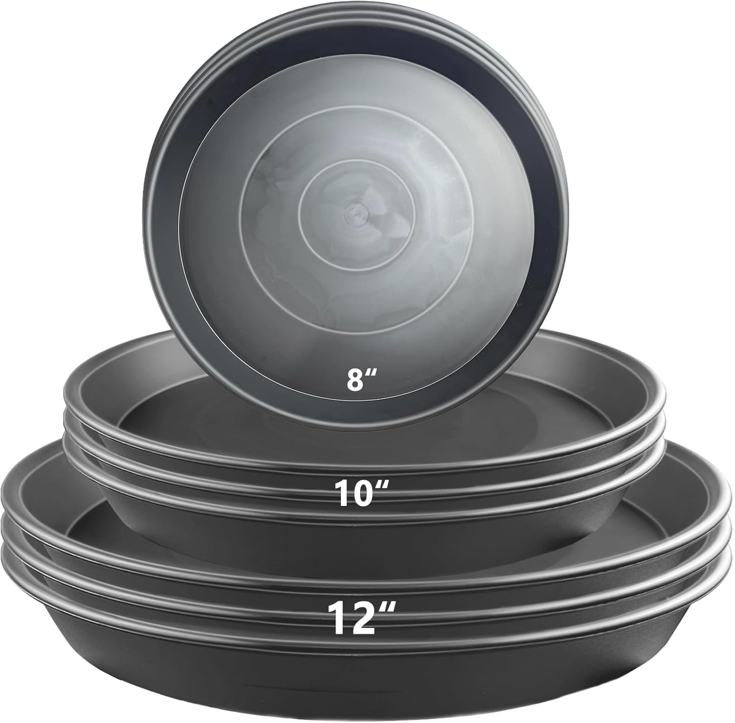- 【Multi-Size Set for Versatile Use】 Includes 9 plant saucers: 3 × 8" (20.5 cm OD / 17 cm ID / 2.7 cm H / each 100 g), 3 × 10" (25.5 cm OD / 21.5 cm ID / 3 cm H / each 135 g), and 3 × 12" (29.5 cm OD / 25.5 cm ID / 3.2 cm H / each 163 g). Perfect for different flower pots and gardening needs.