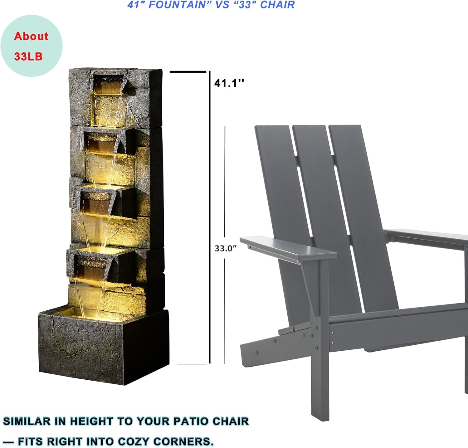 - Elegant 5-Tier Cascading Waterfall Design: This modern outdoor fountain features five vertical tiers, creating a dynamic cascading water flow that mimics the soothing sounds of a natural mountain stream. Perfect for your garden, patio, balcony, or indoor corners, it transforms any space into a peaceful retreat.