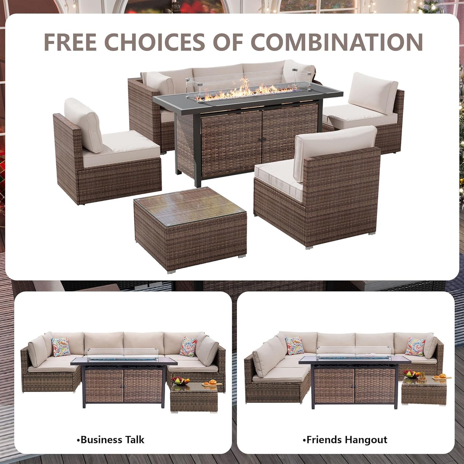 - ăComplete 25-Piece Setă Includes 8 main furniture (1 Fire Pit Table + 1 Coffee Table + 2 Arm Chairs + 4 Armless Chairs) & 17 premium accessories (6 Seat Cushions + 8 Back Cushions + 2 Pillows + 1 Glass Windshield). Everything needed for instant outdoor living