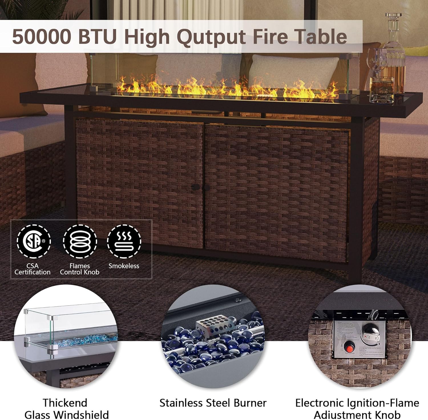 - ăMulti-Function Fire Pit Tableă Features a smokeless fire table (fuel not included) with tempered glass windshield. Enjoy cozy warmth during chilly nights or use as a stylish table