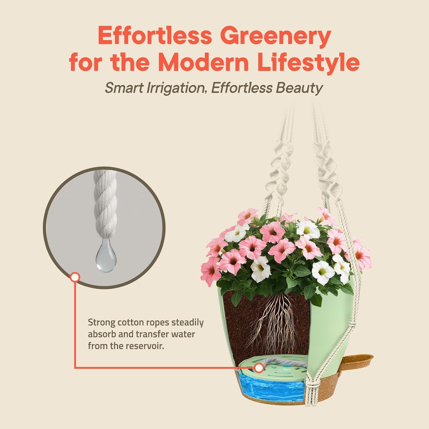 - LOW-MAINTENANCE CARE – Heading on vacation? These self watering hanging pots got you covered. The deep reservoir & watering rope keep your plants hydrated for weeks. Each pot also features a convenient watering lip for easy top-ups without unhooking.