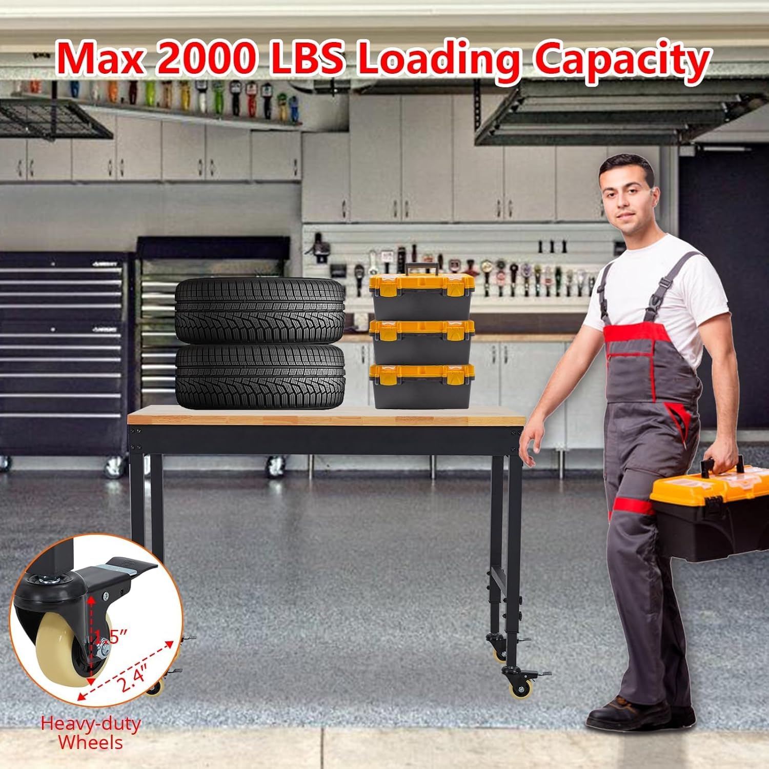 72'' Adjustable Workbench, Heavy Duty Workbench with Power Outlet and Lockable Wheels, 2000 LBS Capacity, Work Table Suitable for Office, Garage, Workshop