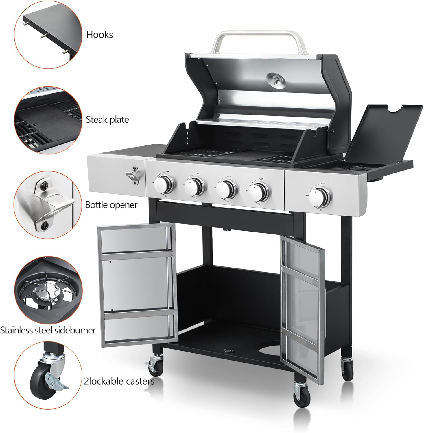 4-Burner Propane Gas BBQ Grill with Side Burner, 46,790 BTU Output, Enameled Cast Iron Grates, Heavy-Duty Stainless Steel Outdoor Grill for Backyard Barbecue