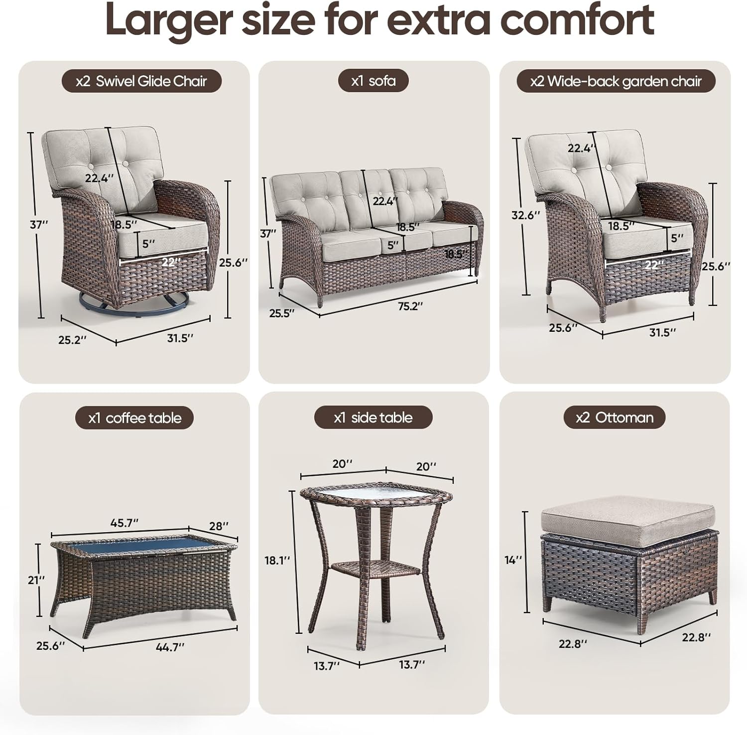 - 【Balcony Furniture Set Includes】: The 9-piece balcony furniture set includes 2 swivel chairs, 2 patio chairs, 1 glass coffee table, 1 side table, 1 sofa, and 2 footstools; the footstools can be used not only for resting your legs but also as small tables or stools. The swivel chairs can support up to 350 pounds