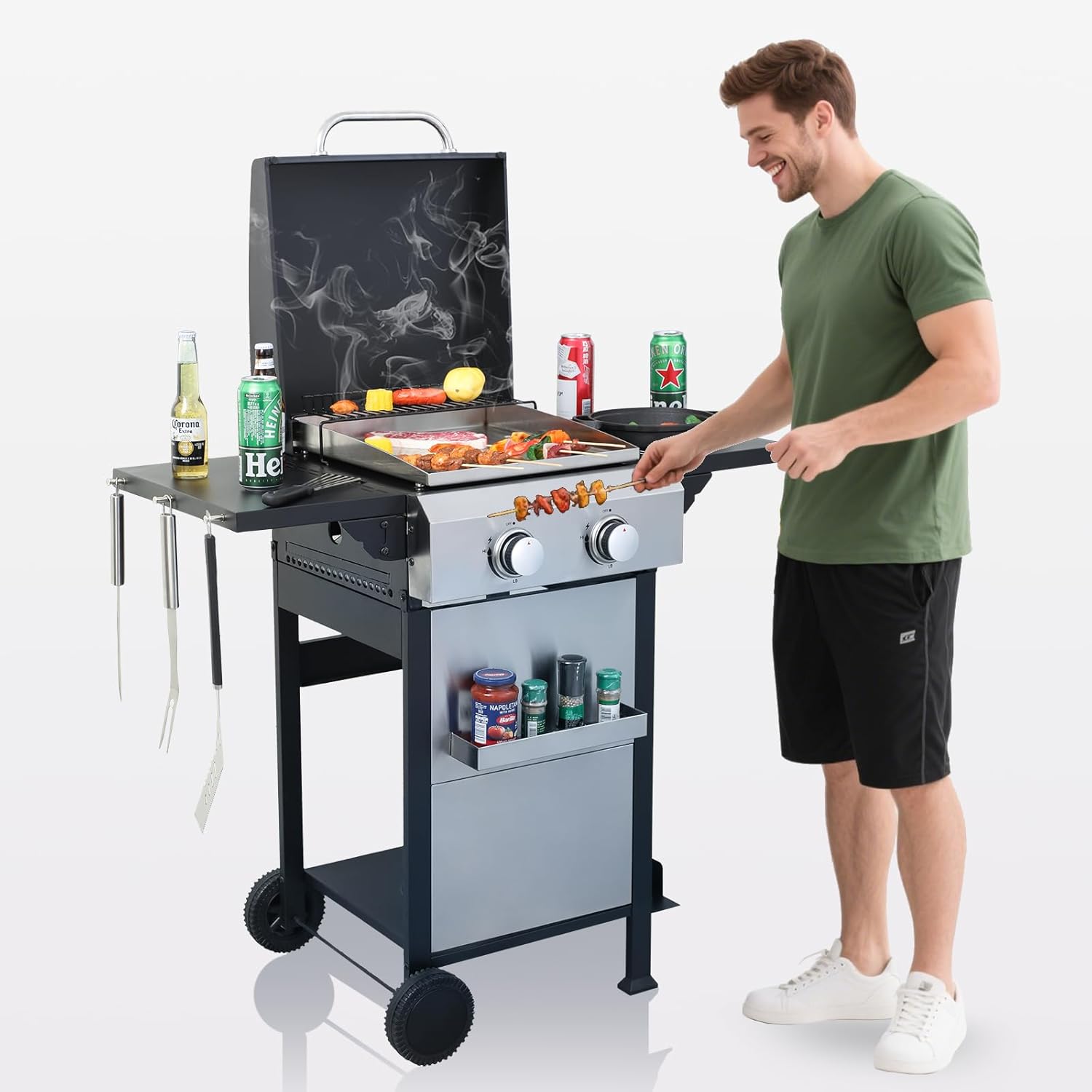 - 🔥 High-Performance Stainless Steel Burners - This propane gas grill features 2 powerful stainless steel burners delivering a total of 24,600 BTU per hour. With a built-in piezoelectric ignition system, you can enjoy instant start-up—just push and turn the control knob. It’s reliable, efficient, and ready to fire up your outdoor meals in seconds.
