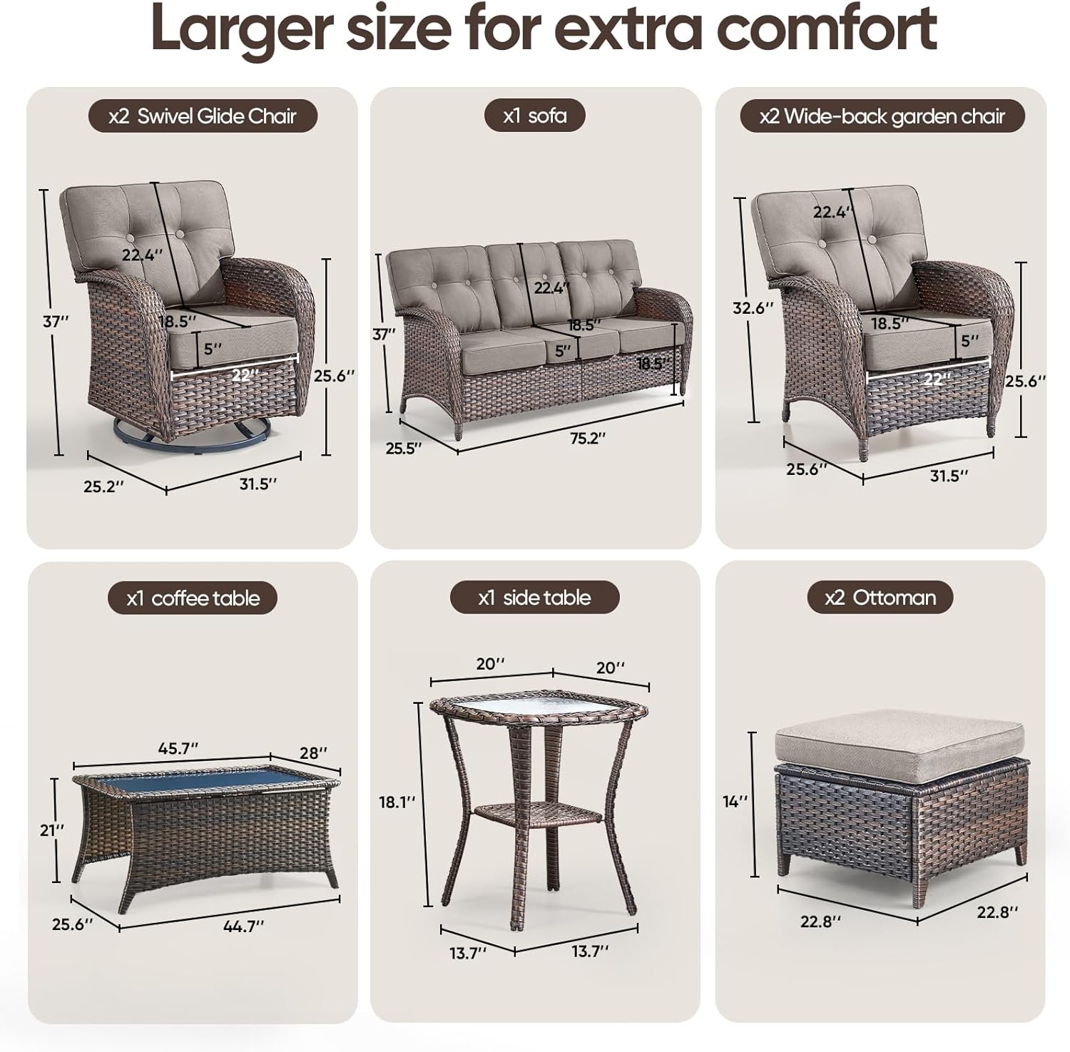 - 【Balcony Furniture Set Includes】: The 9-piece balcony furniture set includes 2 swivel chairs, 2 patio chairs, 1 glass coffee table, 1 side table, 1 sofa, and 2 footstools; the footstools can be used not only for resting your legs but also as small tables or stools. The swivel chairs can support up to 350 pounds