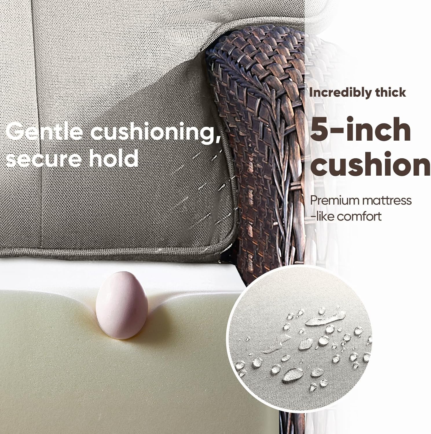 - 【Luxury T-shaped Wide Cushion】: This wicker rocking chair features a 31-inch-wide backrest. The 5-inch cushion on the outdoor rocking chair swivel chair is made of high-density 28D foam, perfectly balancing softness and support. Its quick-rebound properties ensure long-term shape retention and comfort. The backrest is filled with three-dimensional spaced cotton. The cushion cover is made of premium OLEFIN fabric, offering UV resistance, waterproofing, and fade resistance. Compared to ordinary polyester fabric, it is more comfortable and durable