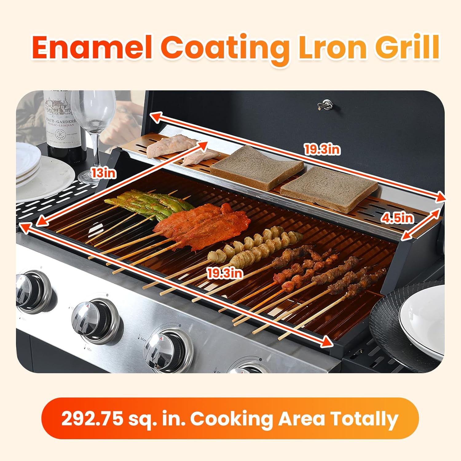 - 🍖 Spacious Cooking & Warming Areas - Equipped with porcelain-enameled wire grates, this gas grill offers a generous 19.3" x 13" cooking area plus a 19.3" x 4.5" warming rack. You’ll have ample space to sear steaks, grill burgers, and keep side dishes warm—all at the same time. Perfect for family meals and outdoor gatherings.
