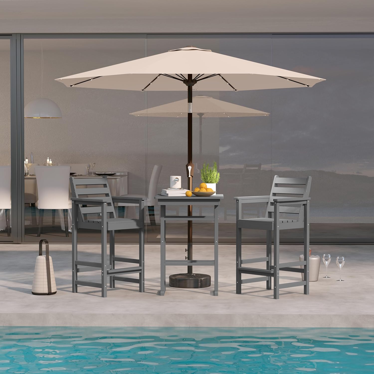 3-Piece Outdoor Bar Set with Beige 9FT Patio Umbrella, HDPE Tall Balcony Adirondack Chairs and Table, All-Weather Outdoor Bar Stools for Patio (Grey)