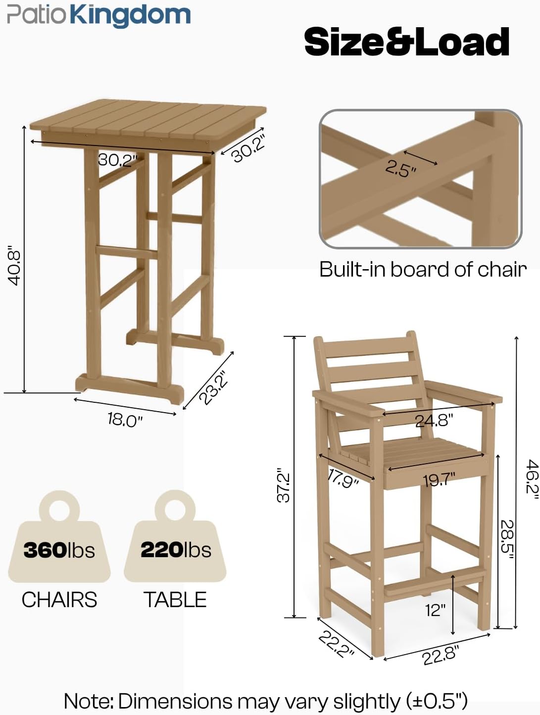 - Spacious & Sturdy Seating: Includes a 30.2" x 30.2" bar-height table and two bar stools, each supporting up to 360 lbs. The generous dimensions make this outdoor furniture set ideal for casual dining, relaxing, or entertaining on a balcony, porch, or garden patio.