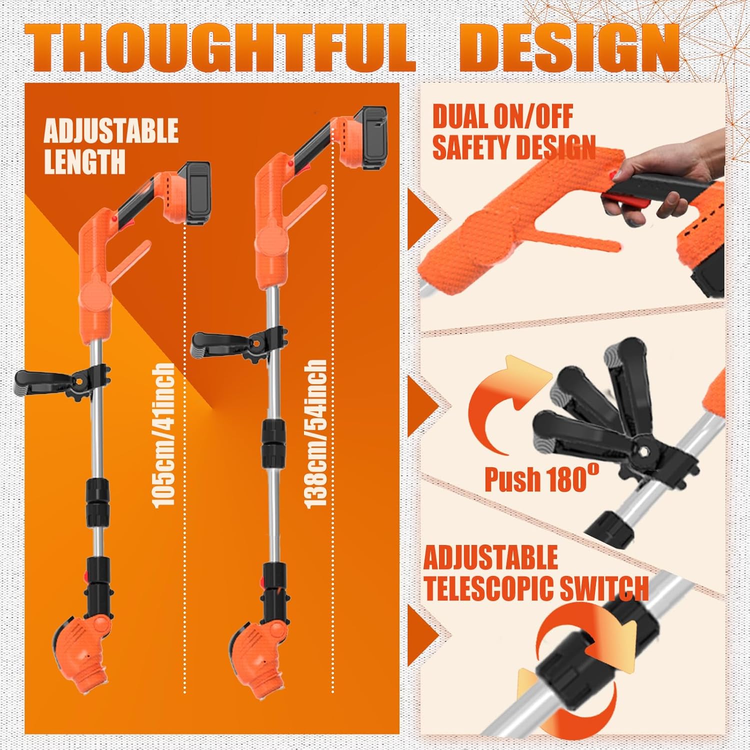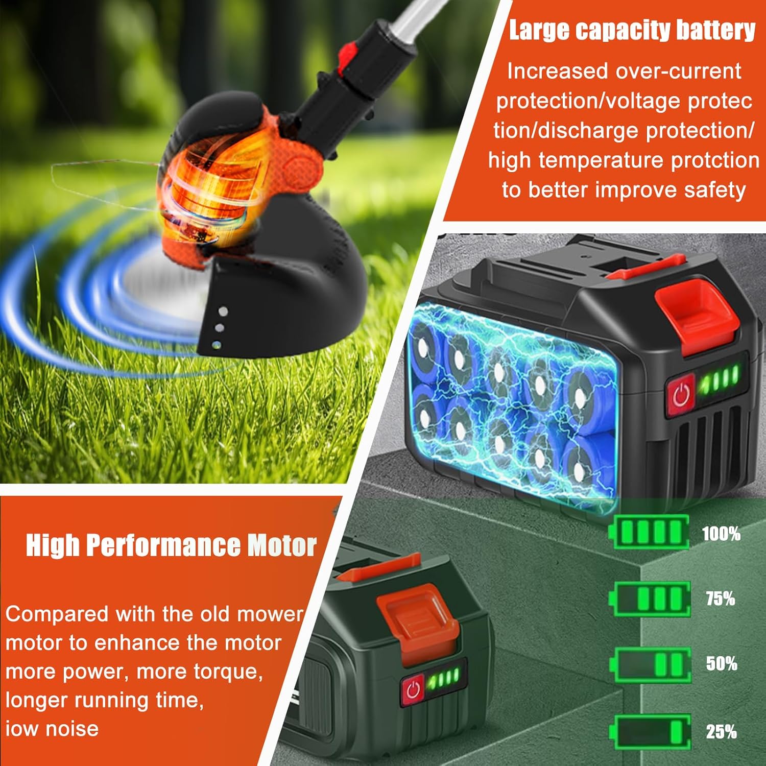 - 【2025 New Upgraded Electric String Trimmers】Our weed wacker battery operated has passed the professional design and safety test. The weed trimmer has been upgraded with smoother wheels, a larger mowing area, higher-strength blades and larger-capacity batteries. And it is 25cm longer than the old stringless trimmer, so you can trim without bending over. And we also come with a weed puller tool, so you can solve the trouble of weeds at one time. Make your lawn and garden perfect and tidy