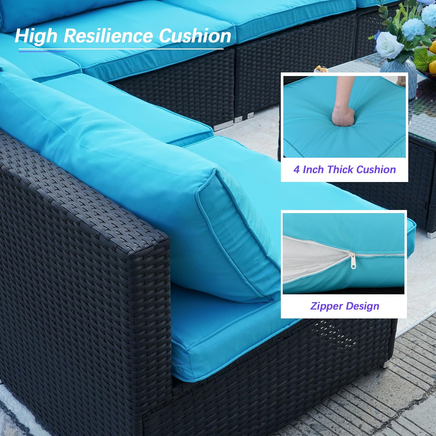 7 Piece Patio Furniture Set, Outdoor Couch Set—All-Weather Outdoor Furniture Sectional w Water Resistant Thick Cushions, Patio Sofa Set w 2 Extra Pillows and Coffee Table, Turquoise/Black