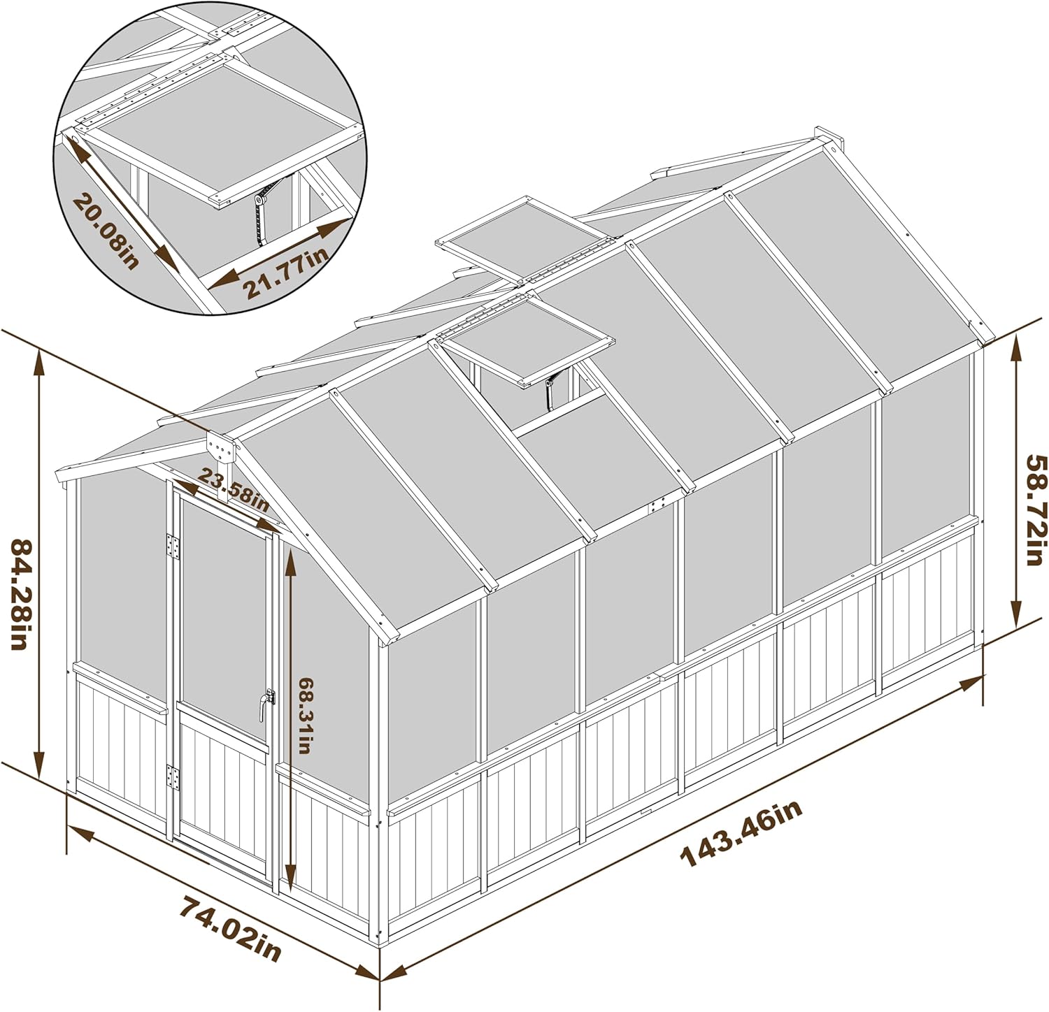 - Adjustable Roof: Our wooden black outdoor greenhouse is designed with adjustable roof which is fixed with the joint to adjust the opening angle. You can adjust the angle to meet your different needs, and the maximum opening angle is 45 degree. Adjustable roof design provides UV protection while ensuring air circulation and temperature balance