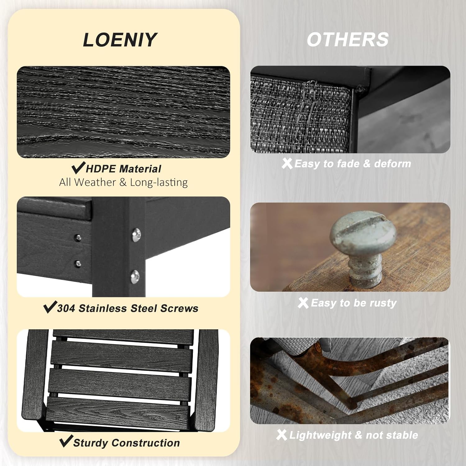 - ăAll-Weather MaterialăMade of High-density polyethylene (HDPE) and 304 stainless steel hardware, this patio dining set is long-lasting and will not crack, scratch, rust, or fade over time. In addition, the table and chairs are designed with an elegant wood-like texture, combining both practicality and aesthetics.