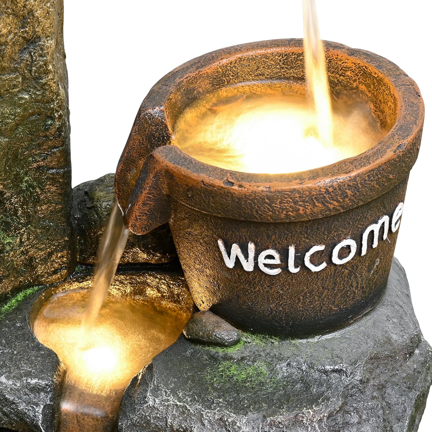 33" Outdoor Garden Water Fountain with Lights 4 Tiers Cascading Large Waterfall Floor Standing Fountain for Patio, Backyard, Deck, Porch and Home Art Decor