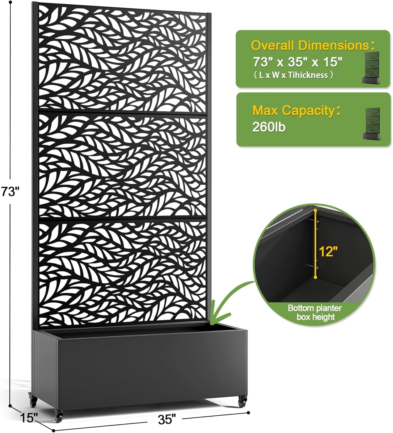 FENCY Metal Raised Garden Bed with Wheels and Trellis,73"x35"x16" Planter Box for Climbing Plants, Vegetables & Vines, Features Privacy Screen and Drainage Holes (Black-Leaf)
