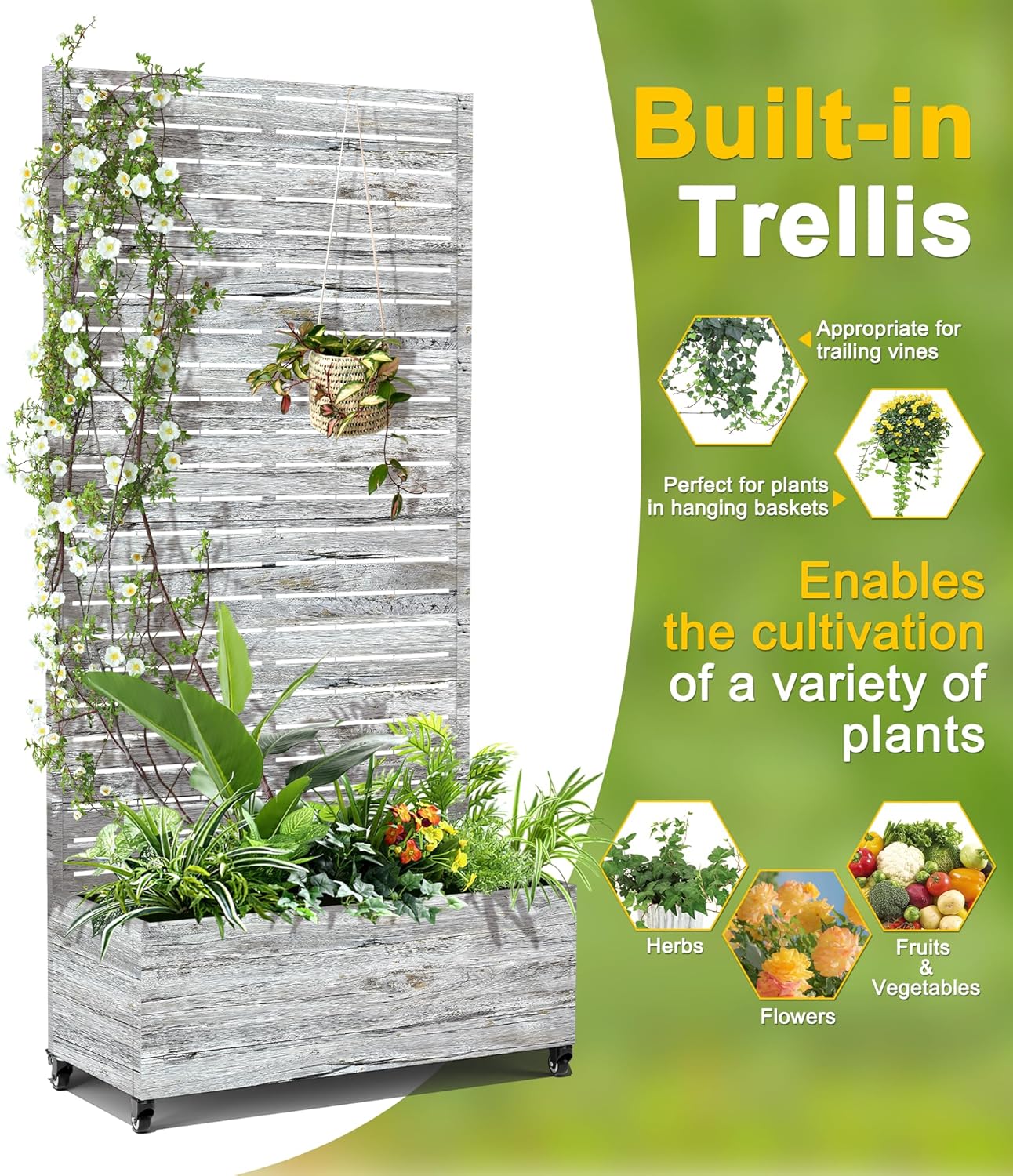 FENCY Metal Raised Garden Bed with Wheels and Trellis,73"x35"x16" Planter Box for Climbing Plants, Vegetables & Vines, Features Privacy Screen and Drainage Holes (White Wood Color)