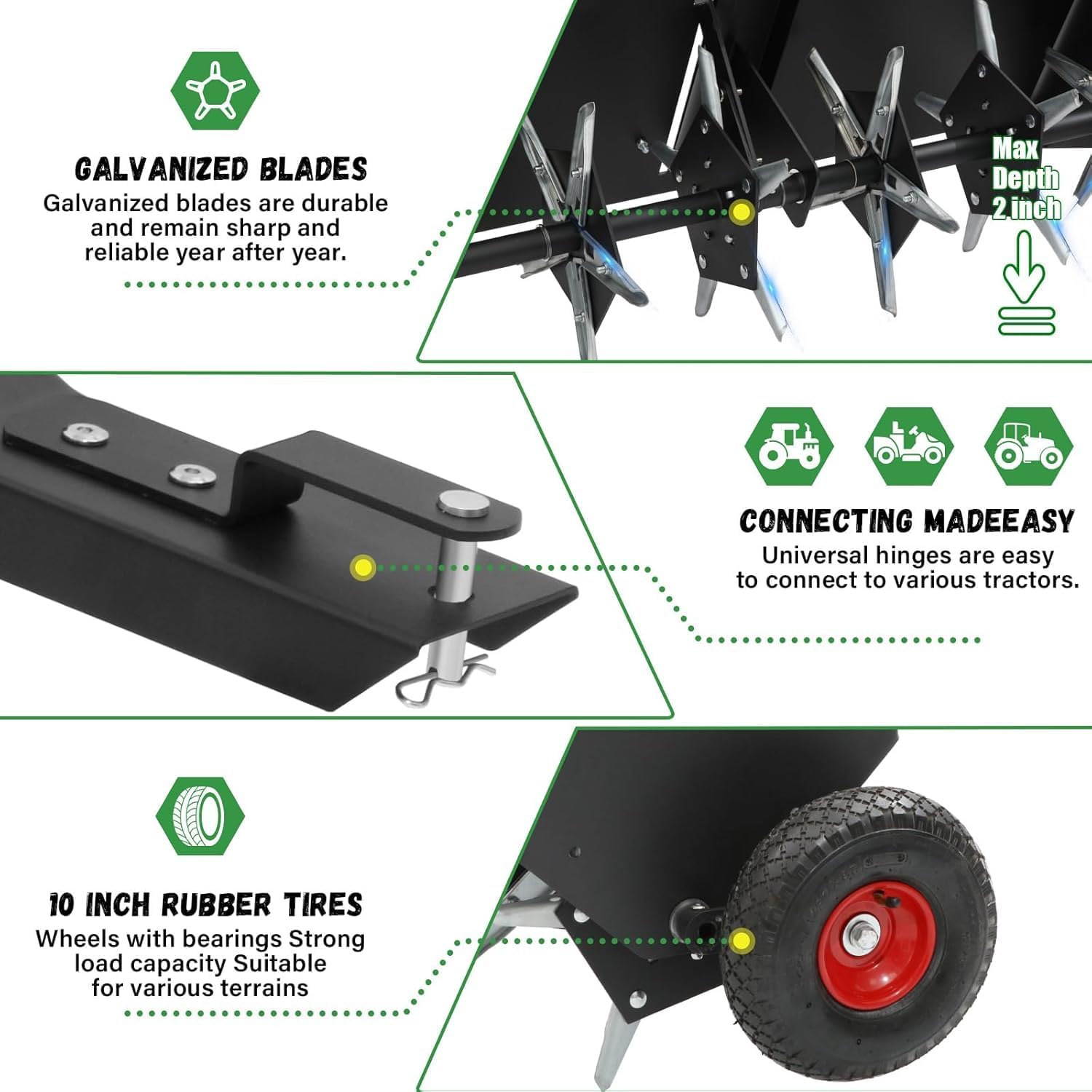 - 【Easy to Assemble and Operate】-The 48"Tow Behind Spike Aerator comes with an instruction manual, you can easily complete the assembly according to the instruction manual, saving your time and easy to operate, the lawn aerator tow behind is suitable for connection to any brand of tractor.