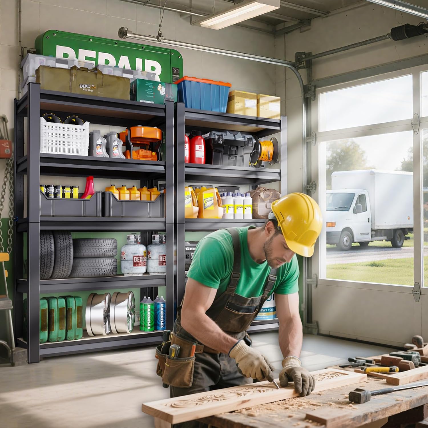 - ①Double Layer Column Design--Garage storage shelves are designed with double layer high strength steel columns, made of high quality steel metal frame + high density wood boards. It has more stable load bearing capacity than other single tier racks on the market. Each wood shelf is with support ribs to ensure that the garage shelving will not bend or deform even if each partition is loaded with 400 pounds, double guarantee, so you can store your things with peace of mind.