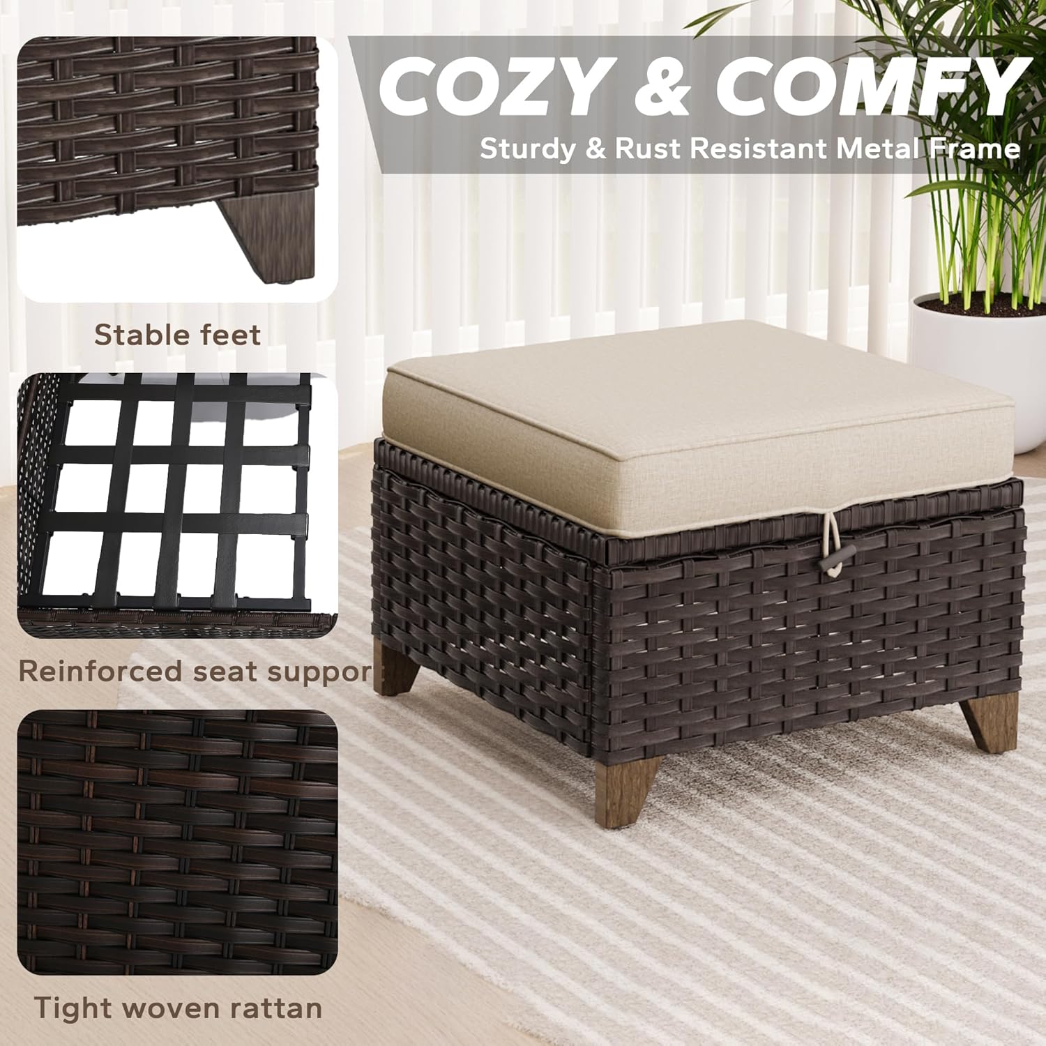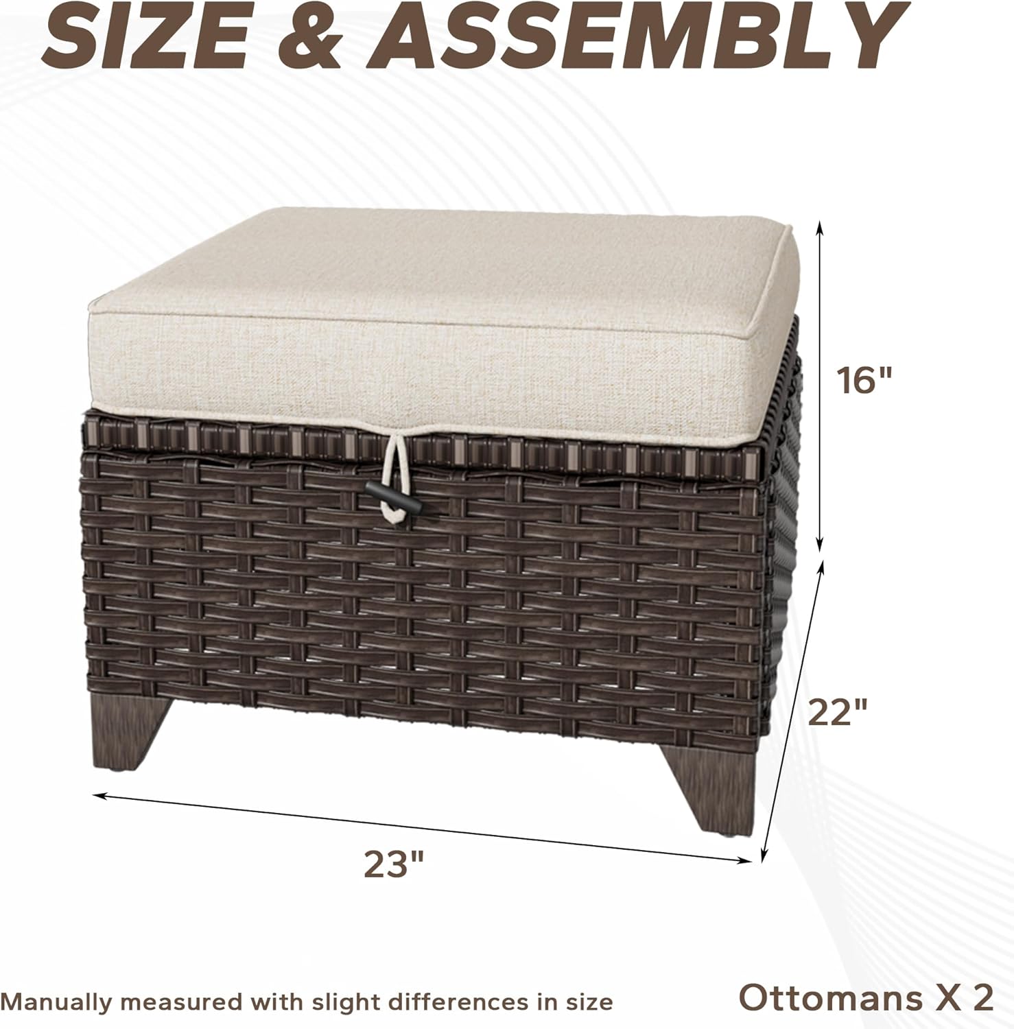 2 Pieces Patio All-Weather Wicker Ottomans with Cushions, PE Rattan Outdoor Conversation Furniture Set for Backyard, Deck, Lawn (Beige)