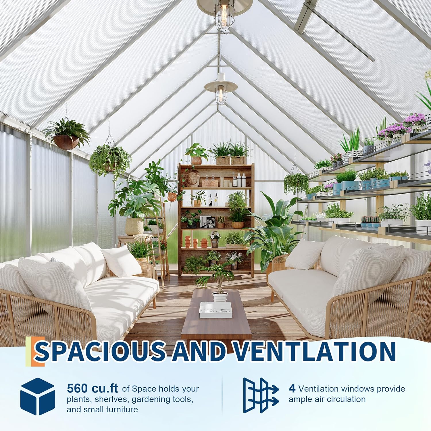 - Upgraded Aluminum Frame - Engineered with high quality aluminum parts, this winter polycarbonate greenhouse with automatic roof vents is built to withstand the elements. Its reinforced, weather resistant frame offers year round durability, ensuring a reliable outdoor gardening environment for all seasons. Wind Rating: 50 mph; Snow Load Capacity: 40 KGS/SQM