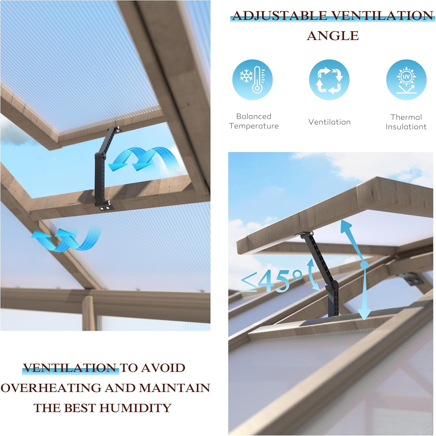 - Adjustable Roof: Our wooden outdoor greenhouse is designed with adjustable roof which is fixed with the joint to adjust the opening angle. You can adjust the angle to meet your needs, and the maximum opening angle is 45 degree. Adjustable roof design provides UV protection while ensuring temperature balance and air circulation