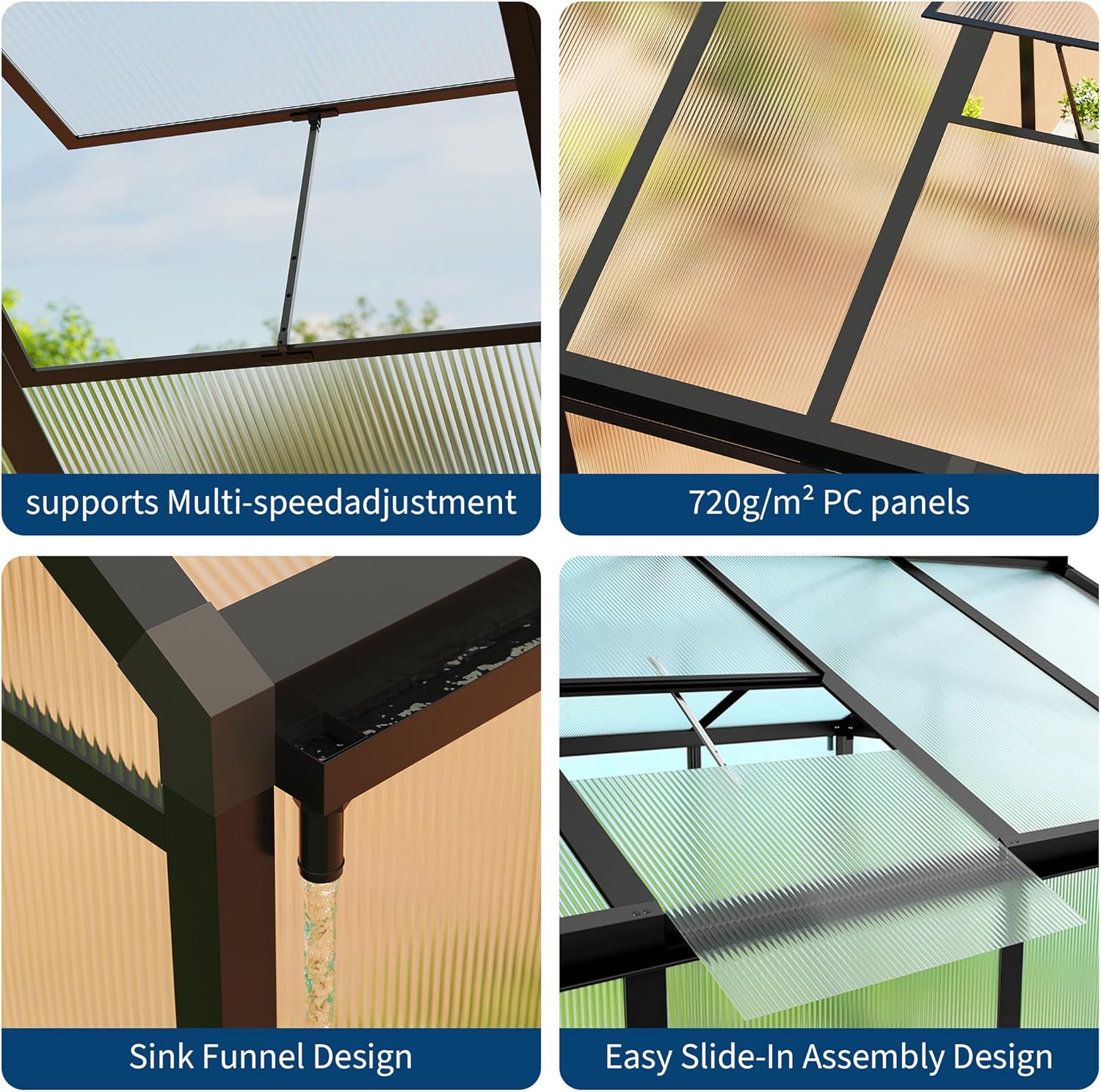 - 【Resilient Construction】Designed to endure challenging weather, our greenhouse features 720g/m² polycarbonate panels and a solid aluminum steel frame. This design ensures stability and protection during heavy rain and gale. Keep your plants safe and thriving in a reliable greenhouse built to last.